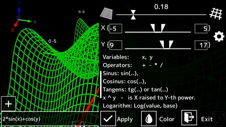 Features: - Detailed 3D-plots - Сustomization - Many functions supported - Functional and simple - Color schemes - sin, cos, tg, log, lg and more