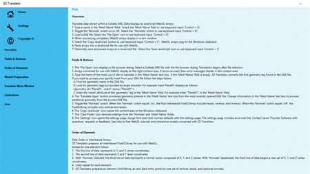 3D Translator helps bridge the gap between 3D development and 3D modeling software. 3D Translator converts data from Collada DAE files into JavaScript arrays for use with WebGL. Output files are useful for Java development with OpenGL ES, as well, with two modifications to the output text files.