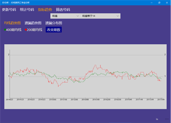 本软件用于福彩3D和体彩排列三专业级指标分析,总共有三百种指标,可以联网或手动更新号码,可由指标筛选号码,既有统计数据又有图形数据,由理论概率和各期号码经严谨计算,数据准确无误,是精心设计的功能较完善的分析软件。