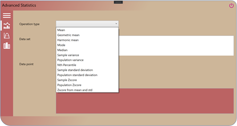 Advanced Statistics is an application that helps calculate different statistical functions. The application covers basic statistics such as mean, geometric mean, harmonic mean, median, standard deviation, mode of a sample and a population. It also covers discrete and continuous statistical distributions, therefore allowing to compute the mean, mode, median, entropy, variance, skewness, cumulative distribution function, probability density function, probability mass function of each distribution when applicable. The distributions covered are:
