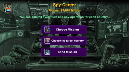 Features: Diplomacy and United Nations Weapon suppliers (USA, France, United Kingdom, Russia and China) Spy Center War Room World News (Economy, Relations, Spy and War) Artificial Intelligence