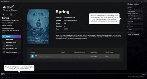 Public screenings just a click away. Organise a legal public screening with a blockbuster or a community specific movie. Artinii Cinema Player differs from other video players by its connection to Artinii's database of films available for public screenings.