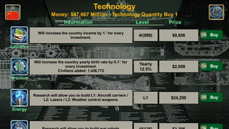The game contains: Weapons Suppliers from around the world, a Spy Center, a War Room, Diplomats, United Nations, an Economy system, Technology, World News Distribution (Economy, Relations, Spy and War) and very advanced Artificial Intelligence.