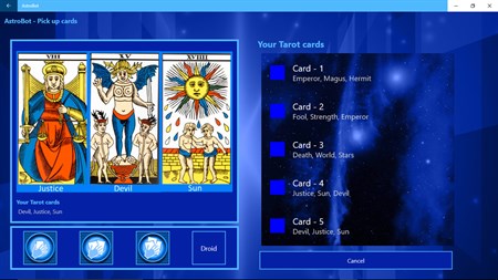 Some fortune teller predictions are available for free, others astrology predictions like yes or no tarot, egyptian horoscope can be obtained through the use of experience points (XP). Do you need help to predict your future? Download the future seer AstroBot, the most complete fortune teller app!