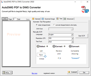Convert PDF into DWG and DXF, as well as vector and raster into vectorized editable drawing, the version of AutoCAD 2022~R14 is supported. In this free trial version, only one conversion result can be saved every day.