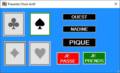 Cette application est un jeu de Belote classique. Il permet de jouer de 1 à 4 joueurs répartis sur 1 à 4 PC. Pour arriver a ce résultat, il existe 3 modes de fonctionnement. 1) le mode de jeu dit : "Apprentissage". se joue sur un seul ordinateur. Le joueur voit son jeu ainsi que le jeu du partenaire et des adversaires. Les joueurs ayant pour nom "ORDINATEUR" sont pris en charge par l'unique PC. 2)le mode de jeu dit : "Entrainement" se joue sur un seul ordinateur. Seul le joueur "NORD" voit ses cartes, les autres joueurs sont cachés et sont pris en charge par le PC. 3)Le mode de jeu dit "Multi - ordinateurs" . Ce mode nécessite d'être connecté sur un réseau local. Le serveur est le joueur "NORD".Lorsque le joueur "NORD" est déclaré "SERVEUR" son "Adresse IP" = 192.168.1.XX apparaît à l'écran. Ce qui permet aux "CLIENTS" de se raccorder facilement sans avoir à chercher le N° d'IP du "SERVEUR". Exemple1 de connexion (le nord et le sud jouent ensembles): Le joueur NORD est sur le PC N° 1. Le Joueur SUD est sur le PC N°2. Les joueurs OUEST et EST sont pris en charge par l'ordinateur NORD(serveur). Exemple 1 de connexion (le nord et le sud jouent ensembles): Le joueur NORD est sur le PC N° 1. Le Joueur SUD est sur le PC N°2. Les joueurs OUEST et EST sont pris en charge par l'ordinateur NORD(serveur). Exemple 2 de connexion (le nord et le sud jouent opposes): Le joueur NORD est sur le PC N° 1. Le Joueur OUEST est sur le PC N°2. Les joueurs SUD et EST sont pris en charge par l'ordinateur NORD(serveur). Dans les options du jeu, on trouve la possibilité de jouer avec ou sans annonce.