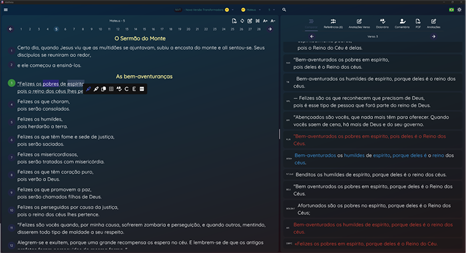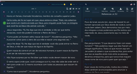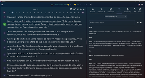 Some of the feactures is: - Compare versions of the bible - References of the verse - Anotations of the verse - Dictionary for words - Commentaries, linked to the chapter/verse - PDF printing - PDF reading - Lexico dictionary - Message/Devocional/Study notes - Text analysis