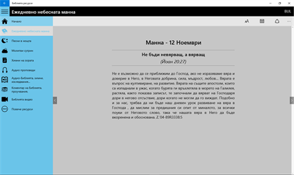 Налични в повече от 10 езика ресурси Free Bible Study, Christian ресурси включва: - Daily Писанието (ежедневно писание с коментари). - Songs в нощта (ежедневно писанията с коментари). - Сутрешни молитви - Химни на зората (1-361). - Audio ресурси - Bible Audio, Библейски изследвания Audio по различни теми, над 1000 християнски химни - Аудио Проповеди - над 15 000 християнските проповеди на различни теми. Можете да ги видите по категории или потърсете тема или говорител. - Библейски Videos - над 150 видео презентации на различни теми - Изучаване на Библията книги, коментара