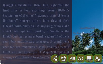 Why: To read text/book with music/audio and photos as background (photos change as page flips; single touch to pause/play music/audio). * Hint to the language learners: When reading a book with its audio, you can use the “Forward” functionality of the music widget to lower the speed of the audio. * Hint: When reading with music, you can use the "Forward" functionality of the text widget to set the pages auto changing speed.
