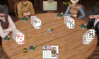 Welcome to the world of Cowboy Cardsharks, where poker games are set in an 1880s-era casino using a 1980s-style interface. This isn't a shoot-em-up, just a laid-back, enjoyable way to learn how to play poker. Relax and have fun!