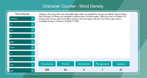 Character Counter - Word Count Count words, characters, sentences, paragraphs, and spaces easily with Character Counter - Word Count. Character Counter - Word Count is a free and easy-to-use windows application for quickly counting words, characters, sentences, paragraphs, and spaces in your text. This application is designed to help you get the exact text count and save time using online character-counting tools. FEATURES OF CHARACTER COUNTER - WORD COUNT • Count as you type. • Count words, characters, sentences, paragraphs, and spaces. • Copy and paste text from other resources and get the count.