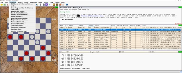 Built-in playing engine Options to include other engines Endgame databases and adjustable opening book Adjustable boards, pieces, piece size and fonts Multiple board, piece and background styles Adjustable piece movement Game database management with drag/drop Database filters PDN validation PDN multi-select Game editor Duplicate finder Database global replace User-editable opening classifications User books Game style - GAYP, 3-move, 11-man, 2-move Game comments and move strength indicators Search for tags, openings, positions, themes Engine matches Recover previous games Printing games (with diagrams) Exporting games to HTML and Video Position setup Copy/paste multiple games and FEN tags Easy management of player names and events Human vs computer mode Two-player mode Infinite Analysis mode Autoplay Automated game analysis Game replay Training levels Time controls Match adjudication settings Sound effects Sample game database