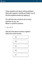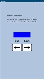Cognitive testing battery - Reaction test, Quiz, Working Memory, Pairing, Stroop-Box, Stroop-Ink, Matrices, Trails, Vocabulary, Symbols. Required software: Adobe AIR. The app does not support Windows 10 S