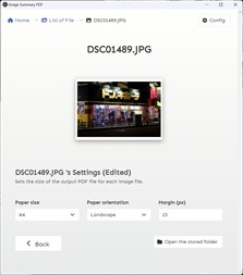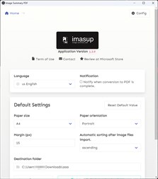 * Image data formats that can be combined are jpeg (jpg), png, webp, and gif. * For each imported image file, the paper size, orientation, and margins of the output PDF can be adjusted. * The destination and file name of the generated PDF files can be changed arbitrarily. * One PDF page per image data will be output to the full width of the image data. * The output PDF files come in six sizes: A3, A4, A5, B4, B5, and B6. In addition, margins can be set from 0px to 50px. * All processing is completed on the terminal, so it can be used in an offline environment. * The application does not involve any communication via the Internet, so there is no external linkage of device information. * When a folder where images are stored is specified, only image data with extensions that can be supported by this application will be included.