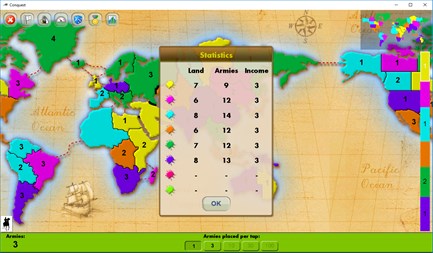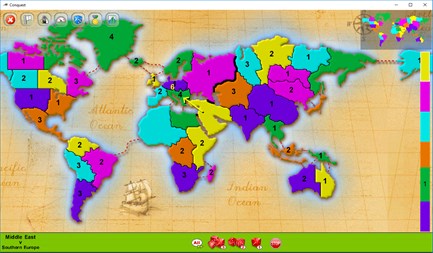 Conquest is a version of the classic board game where you combine risk and strategy to conquer the world. You can play solo or multiple human games against the randomly selected computer controlled opponents, each with their own personality and strong artificial intelligence.