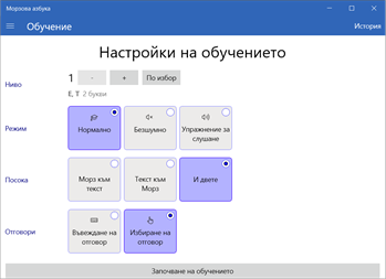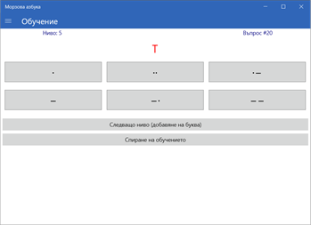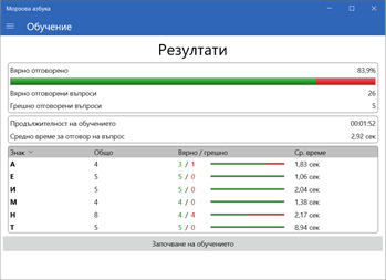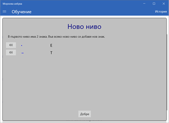 Обучение - Има и прост модул, който може да ви научи на морзовата азбука. - Обучението е разделено на нива. В първото ниво започвате само с две букви. Във всяко ново ниво се въвежда друга буква. Буквите се добавят от най-простите към по-сложните. - Показва се буква или морзова азбука. Можете или да изберете отговора, като докоснете едно от копчетата (въпроси с избираем отговор), или можете да въведете превода. - Изборът на ниво зависи изцяло от вас. Няма нужда да започвате отначало, ако вече знаете някои основи. Също така, преминаването към следващото ниво зависи от вас. Когато се почувствате уверени, че можете лесно да преведете всички букви от текущото ниво, просто докоснете копчето, за да преминете към следващото ниво. - Когато трябва да попълните превода на морзова азбука, тя може да бъде възпроизведена с помощта на високоговорителя. Вие също тренирате разпознаването на морзовата азбука по нейния звук. - Вашите резултати от обучението се запазват, за да можете да следите напредъка си.