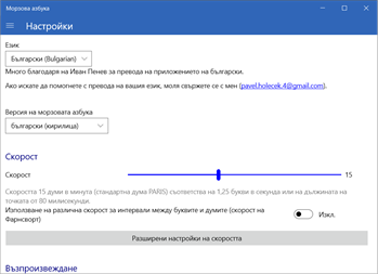 Приложението поддържа и българска версия на морзовата азбука на кирилица. Можете да превключвате между международната и българската версия на морзовата азбука в настройките на приложението.