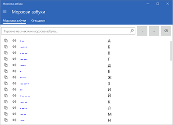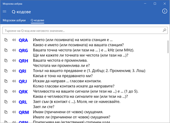 Списък на морзовите азбуки и Q-кодовете - Всички букви и съответните морзови азбуки могат да бъдат показани в една таблица. - Можете бързо да намирате всяка азбука. Просто въведете в ленатата търсената буква или морзовата й азбука. - Има и списък с радиолюбителски Q-кодове.