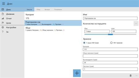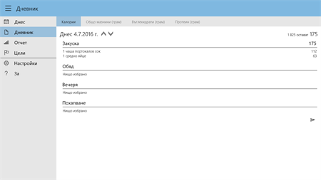 ХАРАКТЕРИСТИКИ: 1. Прост и мощен дизайн: Приложението се отваря директно на менюто запис, на последното хранене, защото това е функцията, която ще използвате най-много. Дизайнът прави добавянето на записи много просто и интуитивно. 2. Запис с едно докосване с персонализирани предложения: Най-често срещаните хранителни продукти веднага могат да бъдат избрани. Започвайки на втория ден, последните ви продукти са предложени, защото може би вие ядете един продукт много често. 3. Не е необходима регистрация: Попълването на лични дании или информация за контакти не е задължително. 4. В базата дании вече са вградени хиляди продукти: Повечето хранителни продукти съдържат точна информация, относно порциите, калориите, въглехидратите, протеiните и мазнините. 5. Пълна офлайн подръжка: Не е нужно да сте свързани към интернет. 6. Точният запис също е лесен: Можете да записвате точното количество, използвайки слайдера. 7. Ежедневени отчети: Използвайки менюто, можете да отворите дирекно дневника, който ви показва обобщението на денят ви. Тук можете да превключвате между калории, протеини и въглехидрати, чрез натискане на малък триъгълник. 8. Проследете целите си: След като въведете вашите лични цели, можете да използвате седмичният отчет, за да видите вашите тенденции. 9. Личните напомняния могат да постигнете целта си: Те са лесен начин да се уверите, че попълвате вашия дневник, след всяко хранене, или в края на деня.