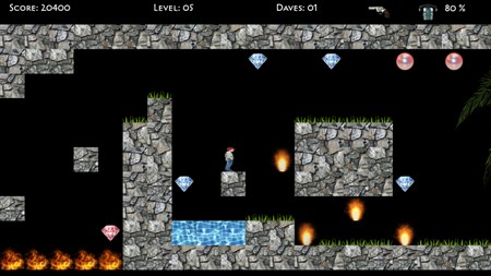 Dangerous Dave Game is classic game which was a popular DOS game. This is a remake of the original Dangerous Dave Game. It is as addictive as the original game, play Dangerous Dave Game and be prepared to loose some productive hours. Bring You Back to The Joy of Old 90s. Play Dangerous Dave like it is 90s + cool improvements (highscore comparison, controls adaptations for touch screen)