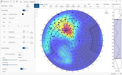 Stereonet plotting application with an intuitive modern interface. View how the data distribution changes down the boreholes, and draw and edit sectors to divide the data into sets.