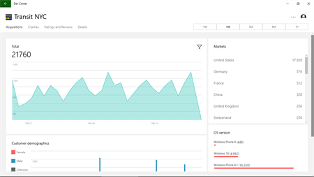 Track the performance of your apps and IAPs, and learn about your customers with details about acquisitions over time by market, customer demographics, and OS version.