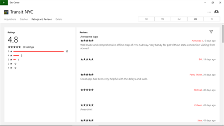 The Microsoft Dev Center app allows you to quickly view details about the health and performance of your Windows Store apps on any Windows 10 device. Note: You must have an active Windows developer account in order to view this data.