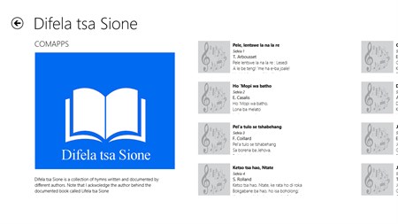 Difela tsa Sione is an app providing the user with comprehensive collection of hymns mostly sang in South African, Lesetho, and Botswana. Difela tsa Sione is a collection of Tswana and Sotho hymns written by different song writers. The word Difela, it is a Setswana word referring to hymns. Most Gospel artists they sing these hymns using different harmony. Difela tsa Sione provides you with lyrics for each and every hymn which is sang in Setswana or Sesotho.