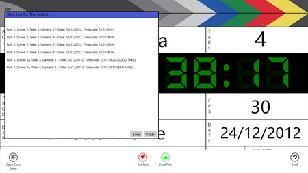 SHORT TIME LIMITED OFFER PRICE UPDATED FOR WINDOWS 8.1 Why pay thousands for an electronic clapperboard when you can purchase Digital Clapperboard for your Windows8/RT device for a fraction of the cost. Digital Clapperboard will allow you to shoot video like a pro. Easily change fields by tapping to the right or left of any number to increase or decrease its value. Features a fully animated clapper along with sound effect and full time code display with user selectable framerate to aid you in synchronizing your video and audio in post production. Capture Snapshot List - When enabled in settings every time you activate the clapper it will snow the data in the snapshot list. This can be used in post. This list is shareable via the Share Charm. Rate Takes - After a take go to bottom appbar to rate the take good or bad. Features will be added to the app based on user requests. Feel free to email me to ask for new features.
