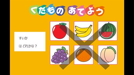 くだものをあてようはイラストを見て出題された名前のくだものを選ぶ子供向け教育アプリです。