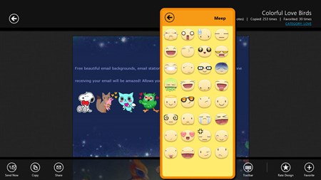 This app let's you create a super fun email by adding image background to your email message. It will also allow you to use emoji icons and Facebook stickers in your email. Fully compatible with desktop/mobile Gmail, Yahoo Mail, OutLook, Hotmail, iOS/Mac Mail and any web based email.
