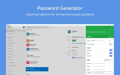 ● Highly customizable password generator ● Automatically checks for weak or compromised passwords ● Automatically monitors for website breaches ● Retains password history for each Item