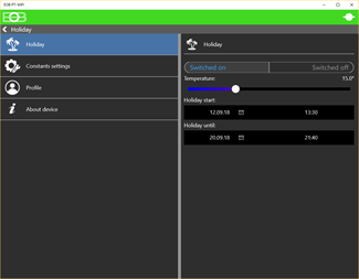 Other benefits and features of the application: - choice of system configuration via WiFi or via USB (PC only) - adding users to control one thermostat - multiple thermostats can be controlled from one application - Display the current room temperature wherever you are - Changing the required temperature - Setting up to 7 week programs - 2 additional programs for even/ odd week mode - AUTO / MANU mode selection - Pre-heating function - Choice of three regulation types (Hysteresis / PI / PID ) - summer mode - Permanently off-off mode - holiday function - Key lock with code - Boiler maintenance - temperature correction - Setting the temperature range - service mode with code - Test the correct connection - Device reset option (Service mode only)