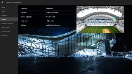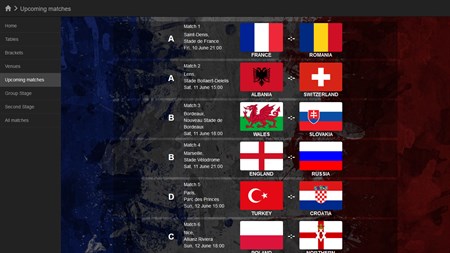 EURO 2016 France Timetable. Shows date and time of games in YOUR local time. Provides you with results of played matches updated daily. Shows list of upcoming matches, tables, venues and brackets. Modern design.
