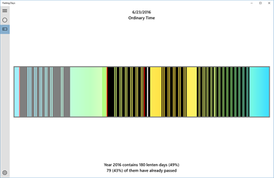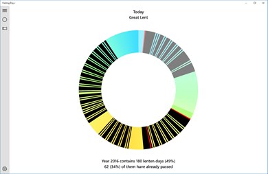 The “Fasting Days” programs visually shows fasting days of selected year in the Orthodox Church, percentage of those days and how many of them have already passed.