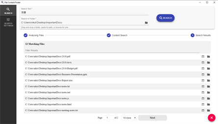 It lets you specify a search phrase and finds all documents which contain it. Other tools only search by file names. File Content Finder inspects the actual file contents and supports most common document formats - pdf, doc(x), xls(x), text files, and many others. It can even search in your scanned documents (png and jpeg files).