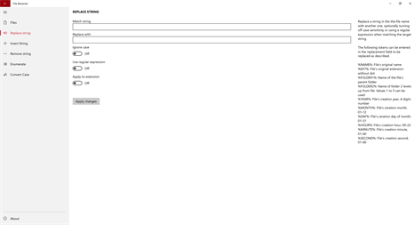 Supported renaming operations - Changing extension - Replacing character strings by others - Inserting a character string - Moving characters - Deleting several characters - Enumeration - Case conversion (upper, lower, title and sentence case) - Regular expressions - And more