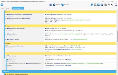 Start making games! Use GDevelop to build and publish your game. It's free, fast, open-source and so easy to use that you'll never look at games the same way. With GDevelop, you can make simple projects for fun, create ambitious indie games or even build the next hit, grossing 1 million downloads like some games powered by GDevelop! What makes GDevelop unique and so easy to use are the events. Events are a powerful way to express the logic of your game, without having to learn a programming language. Publish your games on the web, make a mobile app for iOS and Android, publish on Steam, Facebook, Itch.io, Newsground, the Windows store... Games created with GDevelop run anywhere and can be packaged in a single click.