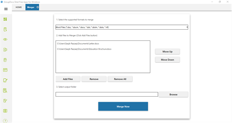 Microsoft Office Documents: Word DOC, DOCX, RTF, Excel XLS, XLSX, PowerPoint PPT, PPTX, Visio VSD, VSDX etc. PDF Documents: PDF, TEX, XPS, OXPS Open Office Documents: ODT, OTT, ODS, ODP, OTP, OTS, ODG, OTG, FODP, FODG PostScript: PS, EPS Images: BMP, GIF, JPG, PNG, TIFF Adobe Photoshop: PSD, PSB Autodesk Design Web Formats: DWF, DWG AutoCAD Drawing: DGN, DWT Document Merger ============================ Easily merge Microsoft Office, OpenOffice, PDF and other documents with the free GroupDocs App for Windows Desktop. You can merge following document types.