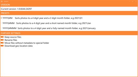 How does Groupic work? - Open the application - Drag and drop your unsorted photo collection into the application window - Give Groupic some time to gain an overview of your favourite photos - In the meantime choose from a variety of options on how Groupic should output your collection. You can choose from a total of three presets. - Additionally you can decide what should happen with the leftover photos inside your source photo collection - If you got geotagged photos you can also opt-in to additionally sort by country and city - Once done select an output folder and let Groupic do the rest - Enjoy your sorted photo collection