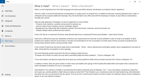 HALAL BAZAR is an application for mobile devices for checking Halal status of the product and services. This edition brings a lot of new features including short description of basic Halal terminology and guides for Halal certified hotels and restaurants.