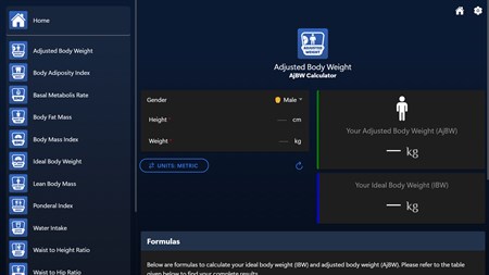 1. Adjusted Body Weight 2. Body Adiposity Index 3. Basal Metabolic Rate 4. Body Fat Mass 5. Body Mass Index 6. Ideal Body Weight 7. Lean Body Mass 8. Ponderal Index 9. Water Intake 10. Waist to Height Ratio 11. Waist to Hip Ratio 12. Weight Gain 13. Weight Loss