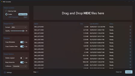 • Drag/Drop or Copy/Paste files for conversion. • Converts locally, so it's fast and secure and doesn't upload anything to internet. • Fully supports 16-bit HEIC color depth, and Hight Dynamic Range (HDR) • Modern Windows styling with dark mode.