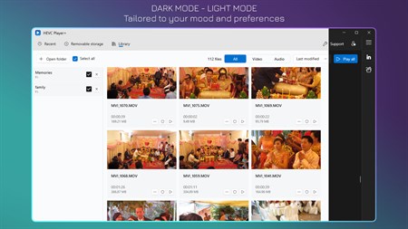 MORE FEATURES • Play HEVC videos from external devices: DVD, Blu-ray, flash memory. • Help to organize videos with: • Display recently played media. • Manage media folders. • Convert video, audio to: • MP4, MOV, MKV, AVI, WMV, WEBM, MXF, M4V, ASF, VOB, OGV, FLV. • MP3, AAC, OGG, FLAC, M4A, M4B, CAF, WAV, AIFF, WMA, AC3, MP2. • Rotate, flip video. • Offer privacy protection with: • Blurring thumbnails of videos and hiding media titles. • Clearing private media from Recent. • Setting PIN to prevent nosy access to private videos and music.