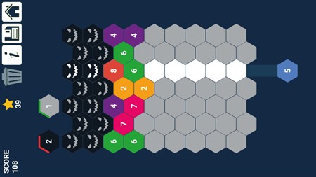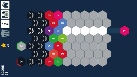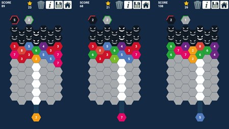 Simple rules: - Every 6 times of no matches: new row of hexa monsters will be generated. - Every 3 successive matches: you can remove 1 row of hexa monsters and reset their timer. - Every match gives 1 star. - It costs 100 stars to remove a tile from the board using the delete button. - The game is over when you run out of tries and stars. - You can manually or automatically save your progress to resume it later.