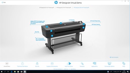 HP DesignJet Virtual Demo is an easy to use sales tool for HP Sales and HP Partners. It has all the information that the sales staff will need for their client visit, providing easy access and a 360º view of the printer which shows the main characteristics of the product, videos, technical data sheets and documentation which is continually updated with the most up-to-date version. With this tool you can compare products in the HP DesignJet family, accessories, catalog of applications, information on HP services and the ability to share valuable information with your client and much more