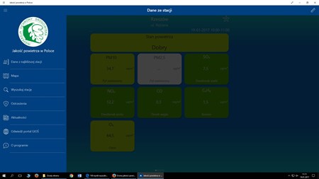 NAJWAŻNIEJSZE FUNKCJE: • Przy dostępie do Internetu i włączonych usługach lokalizacyjnych, aplikacja po uruchomieniu na głównym ekranie pokazuje dane z najbliższej stacji pomiarowej lub z wybranej stacji, gdy usługa lokalizacji jest wyłączona. Po wyborze ulubionej stacji aplikacja przy wyłączonym GPS domyślnie pokazuje dane z tej stacji. • Aplikacja wysyła powiadomienia „push” w przypadku wystąpienia przekroczeń poziomów informowania lub alarmowych zanieczyszczeń oraz przy publikacji nowych aktualności na portalu jakości powietrza GIOŚ. • Aplikacja jest dostępna w wersji na urządzenia mobilne (Windows Phone) oraz komputery klasy PC (Windows 10).
