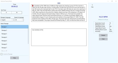 Keyboard typing master is the best app for practice your typing speed test, This app can calculated keystrokes, backspaces, word count, wrong word count, pending words, speed. Also you can set timer before start the test. also default multiple passage available and also you can create your own passage.