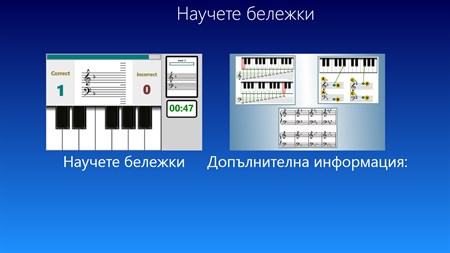 Има и основна информация за grand персонал, музика остри, плоски и ключови подписи, за да обновите вашите музикални познания.