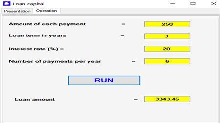 This application is intended to calculate the loan amount. We must indicate the loan term in years, the amount of each regular payment, the annual number of payments and the interest rate.
